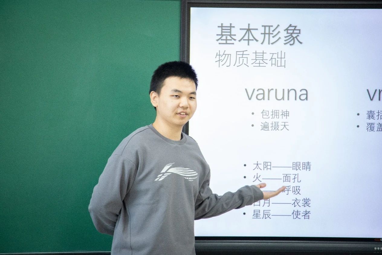紧接着,侯方笛同学以《梨俱吠陀》中伐楼拿神的道德性及其地位的衰落为题,带领大家走进古印度宗教哲学的深邃世界,探讨了道德与神性之间的微妙联系。