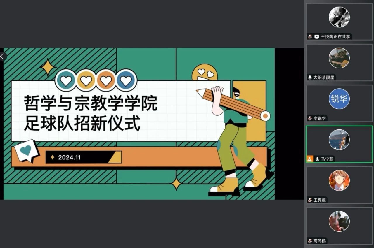 足球队招新仪式。本次招新仪式以线上会议的形式开展。在会议的开始,学院足球队队长高鸣鹤同学简单介绍了学院足球队的基本情况并宣读学院足球队本届纳新名单。几位新成员的加入为学院足球队注入了鲜活的力量。随后,23级足球队代表马乃新同学进行发言,对新成员的加入表示热烈欢迎。24级新成员代表何飞含同学进行发言,表达了新成员为学院足球队未来发展做出积极贡献的美好心愿。